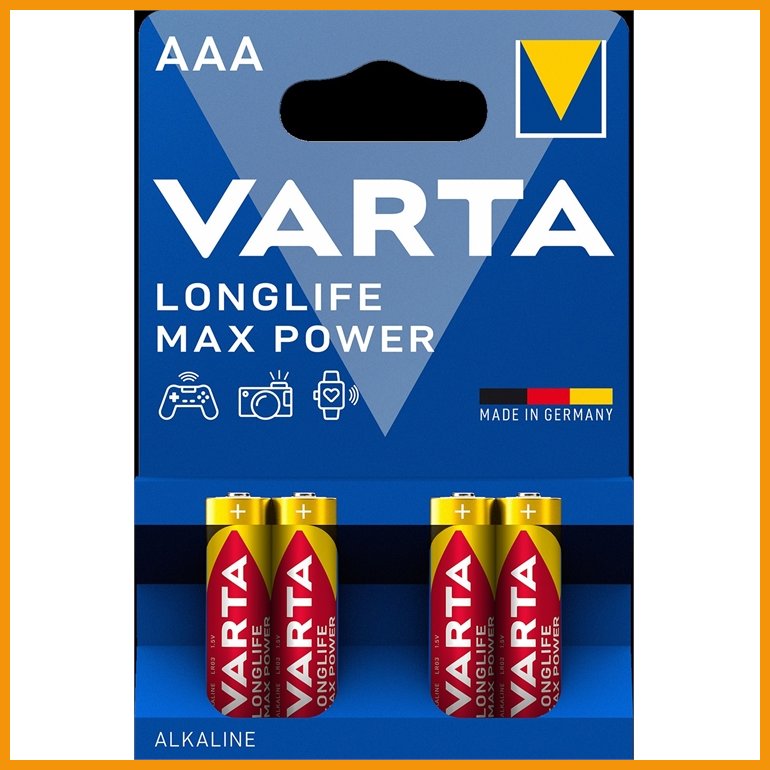 Varta Longlife Max Power -alkaliparistot ovat korkealuokkainen valinta laitteisiin, joissa on täsmällisen virran tarve, kuten digikameroihin, peliohjaimiin, verenpainemittareihin, droneihin jne. Varastointiaika on 10 vuotta.Tuotteella on Joutsenmerkki-tunnus.
