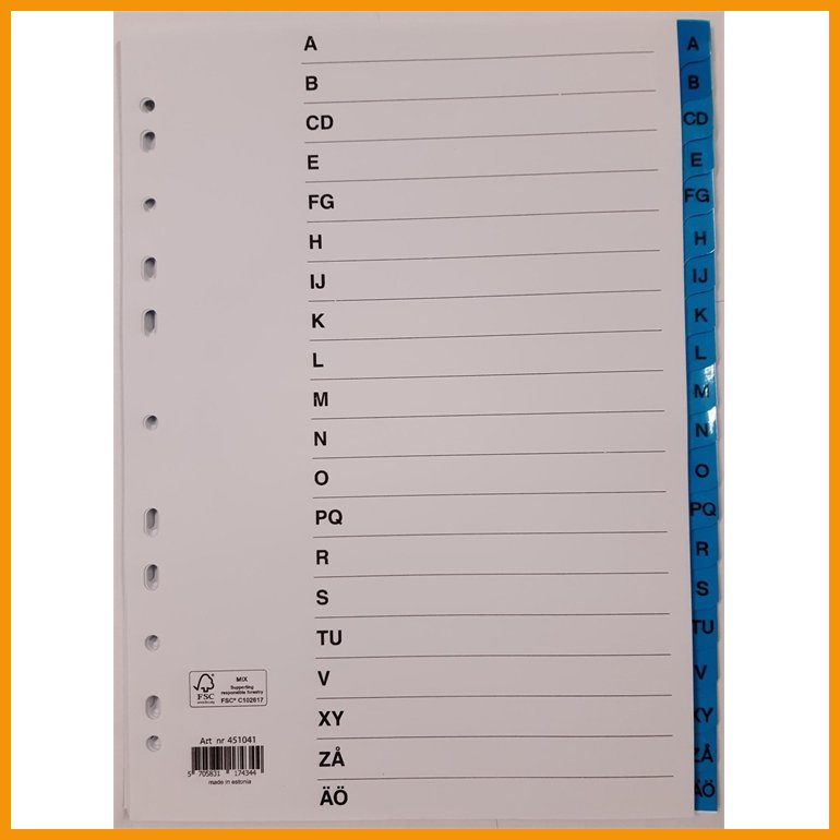 Aakkosvälilehti A4 A-Ö PP valkoinen on korkeatasoinen toimistotarvike, jonka toimituksen kesto on verkkokaupasta tilattuna 1-2 päivää. Huomaa, että Toimitus on ilmainen kaikilla verkkokaupan ostoksilla, joiden hinta on yli 140 €. Meiltä voit tilata laskulla ja ilman rekisteröitymistä.