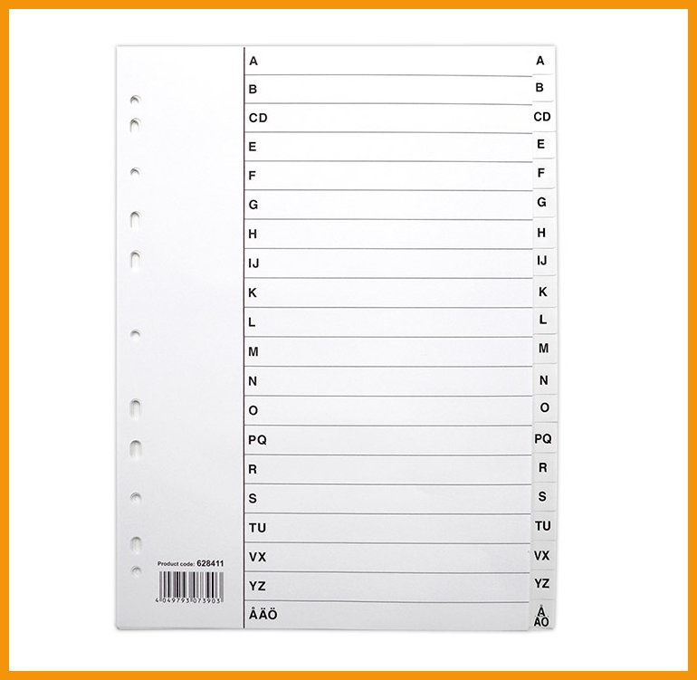 Aakkosvälilehti A4 muovi A-Ö on erinomainen toimistotarvike, jonka verkkokauppatilauksen toimitus perille kestää 1-2 päivää. Huomaa, että toimitus on ilmainen yli 140 € hintaisille verkkokauppa ostoksille! Meiltä voit tilata laskulla ja ilman rekisteröitymistä.
