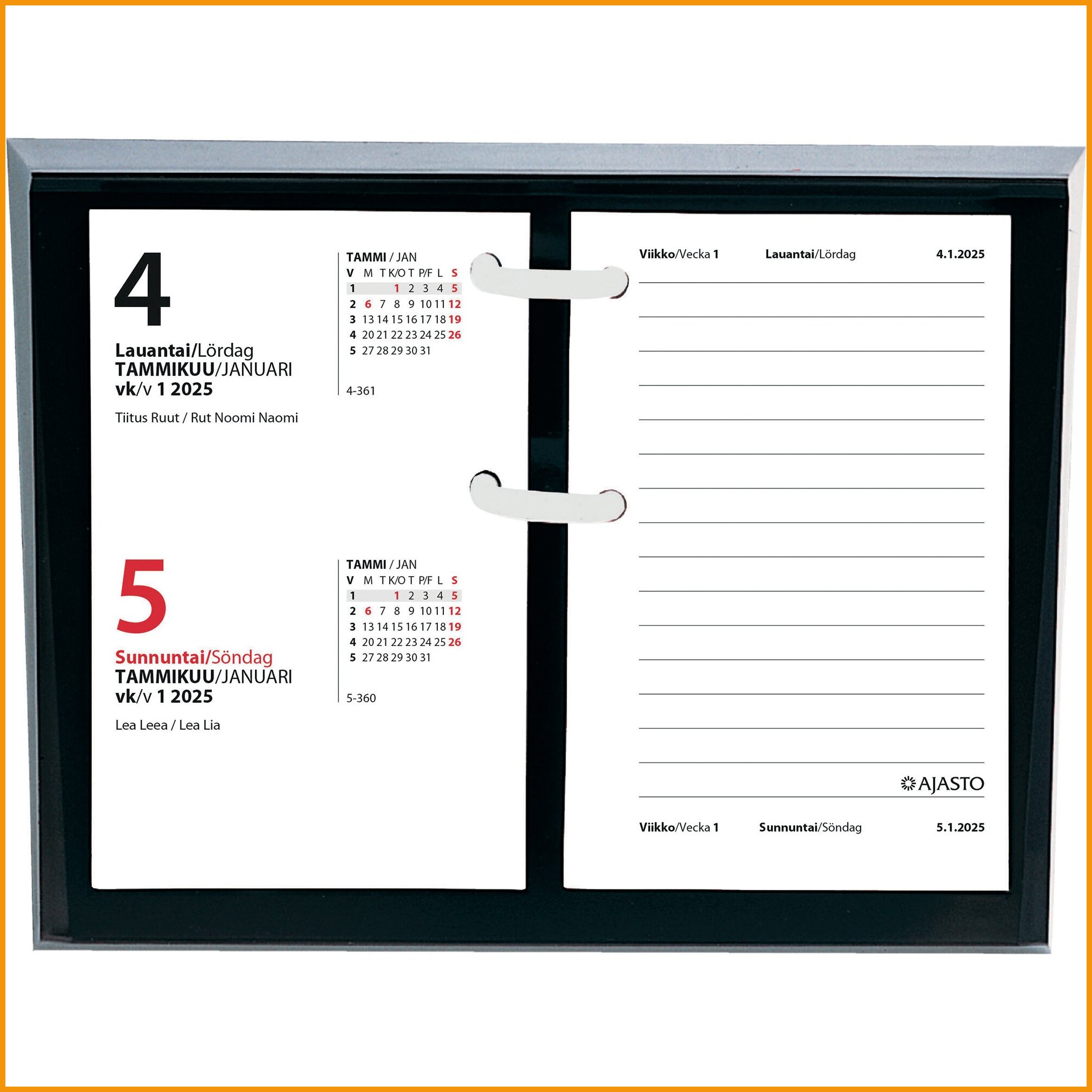Ajasto Pöytäpäivyrin alusta musta on tarkoitettu käytettävän yhdessä 83 x 109 mm kokoisen Ajasto pöytäkalenterin kanssa. Kalenteri sopii avattuna täydellisesti alustan raameihin ja se pitää kalenterin pöydällä tukevasti paikallaan. Alusta on valmistettu muovista. Kalentereilla ei ole vaihto- eikä palautusoikeutta.
