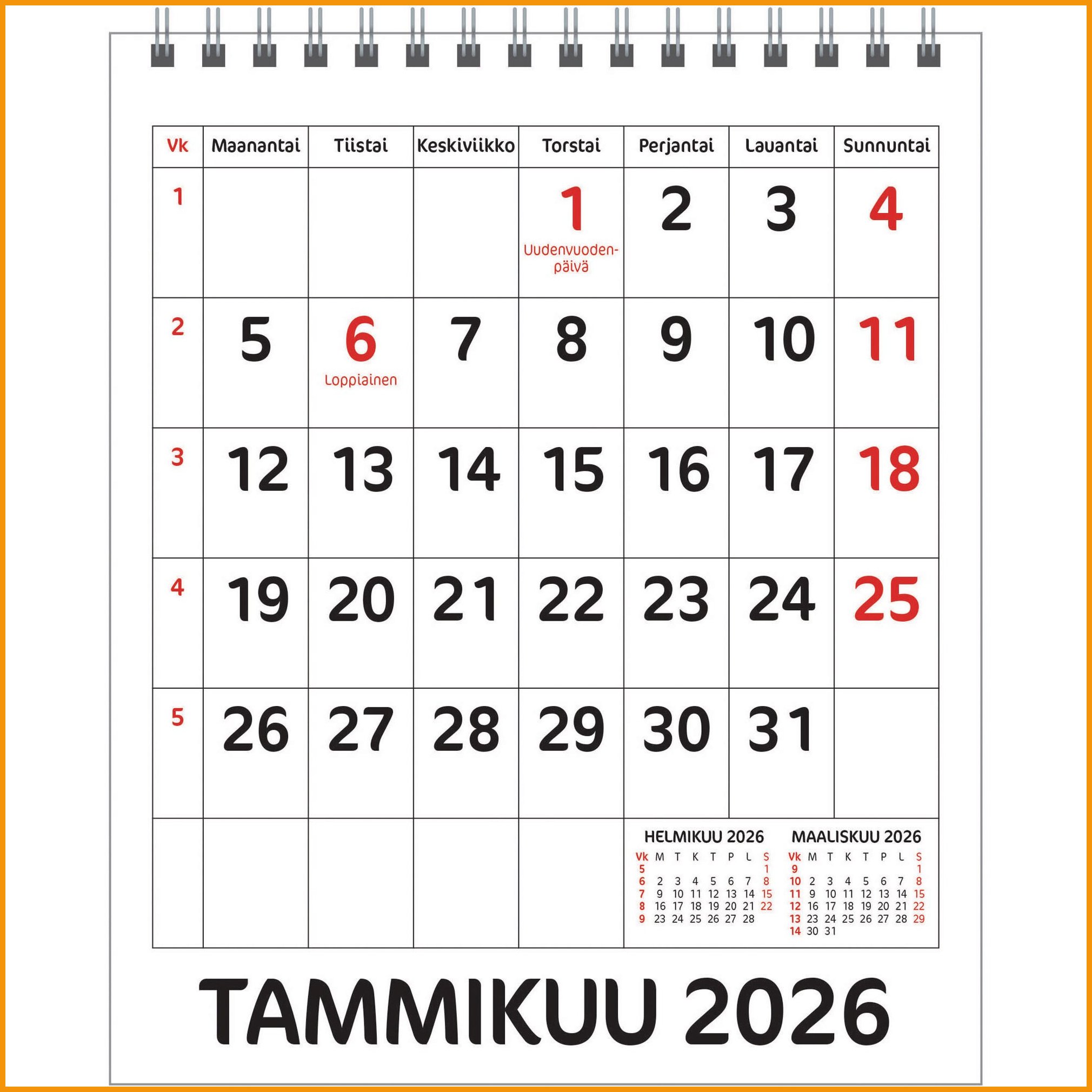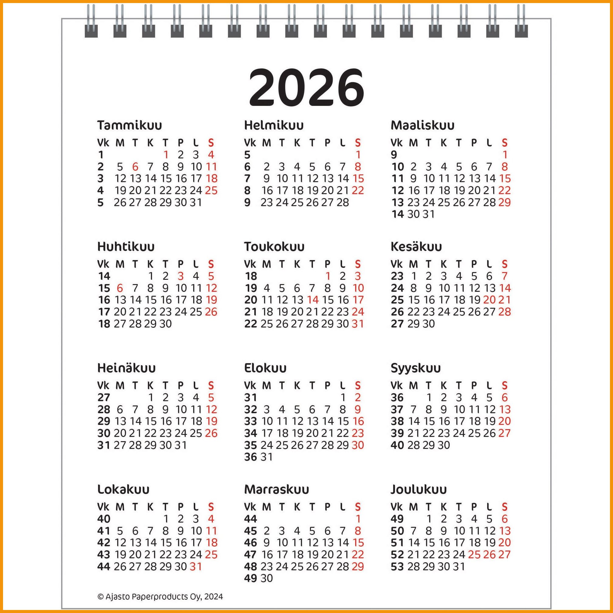 Ajaston Työpöytäkalenteri, kätevän kompakti koko pöydälle. Koko 145 x 175mm Etupuolella kuukausi ja takana vuosi. Kalentereilla ei ole vaihto -eikä palautusoikeutta.Ajasto työpöytäkalenteri 2026 on tasokas kalenteritarvike, jonka verkkokauppatilauksen toimitus perille kestää 1-2 päivää. Muistathan, että toimitus on ilmainen yli 140 € hintaisille verkkokauppa ostoksille! Meiltä voit tilata laskulla ja ilman rekisteröitymistä.