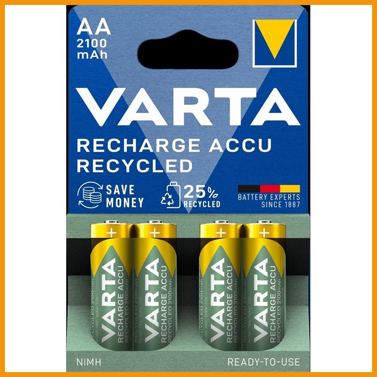 Ladattavat Varta Recharge Accu Recycled -akkuparistot ovat taloudellinen ratkaisu energiatarpeisiin. Ready To Use -akkuparistoja ei tarvitse ladata ennen ensimmäistä käyttökertaa, mutta ensimmäisen varauksen loputtua ne voidaan ladata jopa 1000 kertaa. Käytä aina lataamiseen akkuparistoille tarkoitettua laturia.Tuote on valmistettu 25-prosenttisesti kierrätysmateriaalista.
