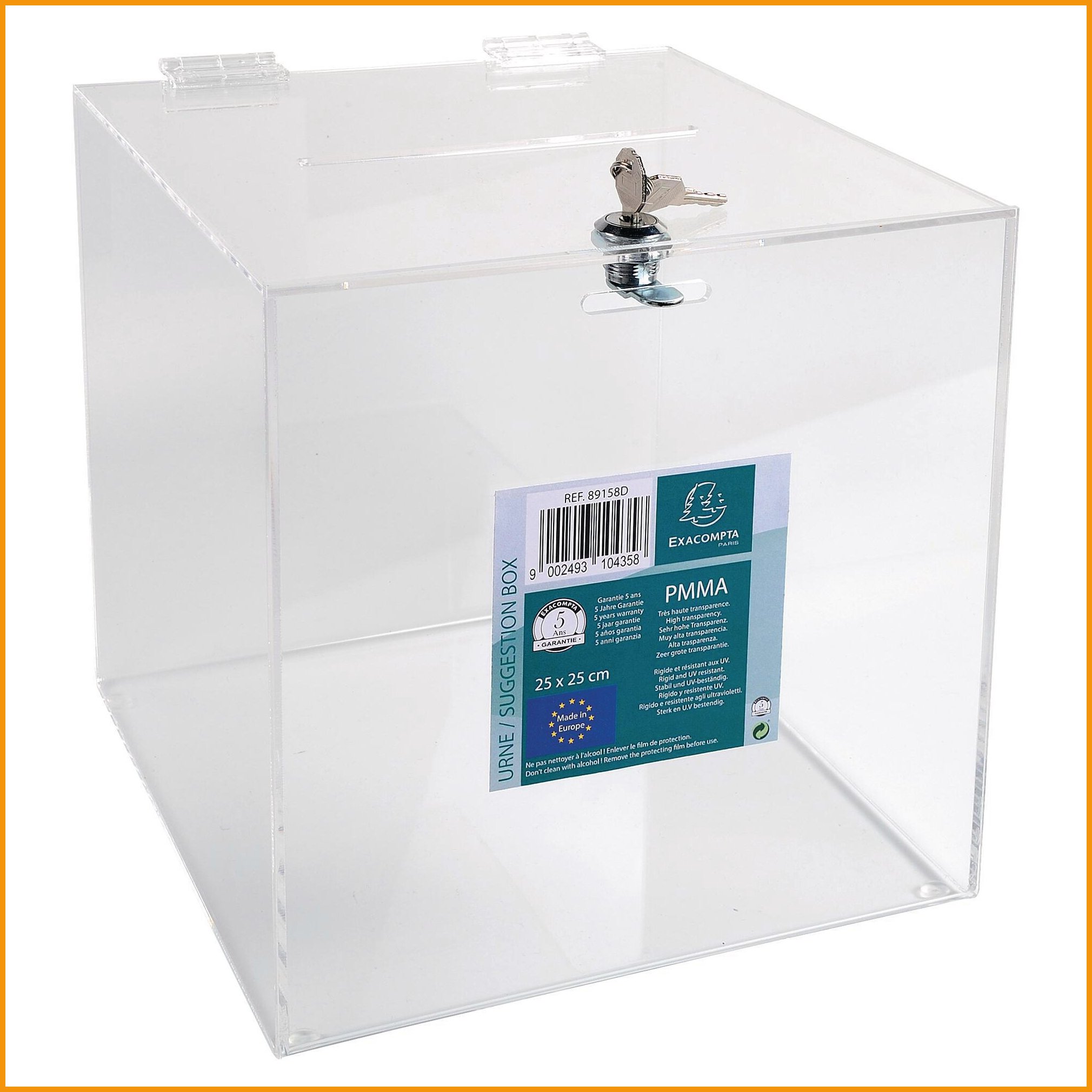 Exacompta aloitelaatikko 25 × 25 × 25 cm on tyylikäs ja turvallinen ratkaisu arvontoihin, äänestyksiin ja palautteiden keräämiseen niin yrityksissä, tapahtumissa kuin julkisissa tiloissakin. Tämä kirkas ja moderni ehdotus- ja arvontalipas on valmistettu laadukkaasta, erittäin kirkkaasta PMMA-akryylistä, joka tuo sisällön näkyvästi esille mutta pitää sen samalla suojattuna. Lippaassa on saranallinen ja lukittava kansi, joka varmistaa, että arpalipukkeet, äänestysliput tai palautelomakkeet pysyvät turvassa ja koskemattomina. Kestävä ja tukeva rakenne on suunniteltu kestämään iskuja sekä UV-valoa ilman kellastumista, mikä tekee laatikosta pitkäikäisen myös vaativassa käytössä. Selkeä ja ajaton muotoilu sopii erinomaisesti esille myymälöihin, messuille, vastaanottoihin ja muihin näkyviin tiloihin. Kuution muotoinen 25 × 25 × 25 cm koko tarjoaa runsaasti tilaa yhdelle lokerolle ja tekee laatikosta helposti sijoitettavan pöydälle tai tiskille. Läpinäkyvä pleksilasi korostaa ammattimaista ilmettä ja lisää luottamusta esimerkiksi arvonnoissa ja äänestyksissä. Euroopassa valmistettu Exacompta aloitelaatikko on laadukas valinta, kun etsit kestävää, lukittavaa ja visuaalisesti näyttävää arvonta- tai palautelaatikkoa pitkäaikaiseen käyttöön.Aloitelaatikko Exacompta 89158d , kirkas on erinomainen toimistotarvike, jonka toimituksen kesto on verkkokaupasta tilattuna 1-2 päivää. Muistathan, että ilmainen toimitus on kaikilla yli 140 € hintaisilla tilauksilla! Meiltä voit tilata laskulla ja ilman rekisteröitymistä.