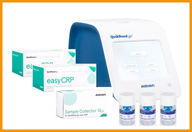 QuikRead-aloituspakkauksessa on kaikki tarvittava: QuickRead go -laite, QuikRead go easy CRP -vieritesti (2 x 50 kpl), QuikRead go CRP -kontrollit 1 ml noin 6 kk tarpeeseen (3 kpl), QuikRead go 10 ul -näytteenottimet noin 6 kk tarpeeseen (50 kpl).