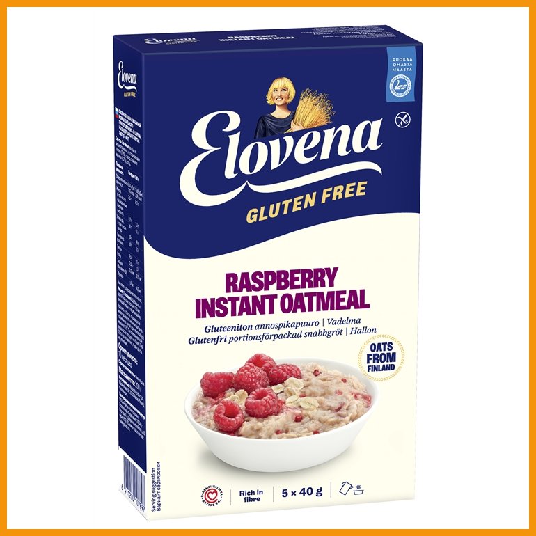 Elovenan gluteeniton ja vadelmanmakuinen annospikapuuro valmistuu minuutissa ja antaa energiaa päivän ponnistuksiin. Puuron valmistamiseen tarvitset vain lautasen ja kiehuvaa vettä. Runsaskuituinen tuote on valmistettu Suomessa suomalaisesta kaurasta ja sille on myönnetty Sydänliiton Sydänmerkki.Pakkauksessa on 5 annospussia.