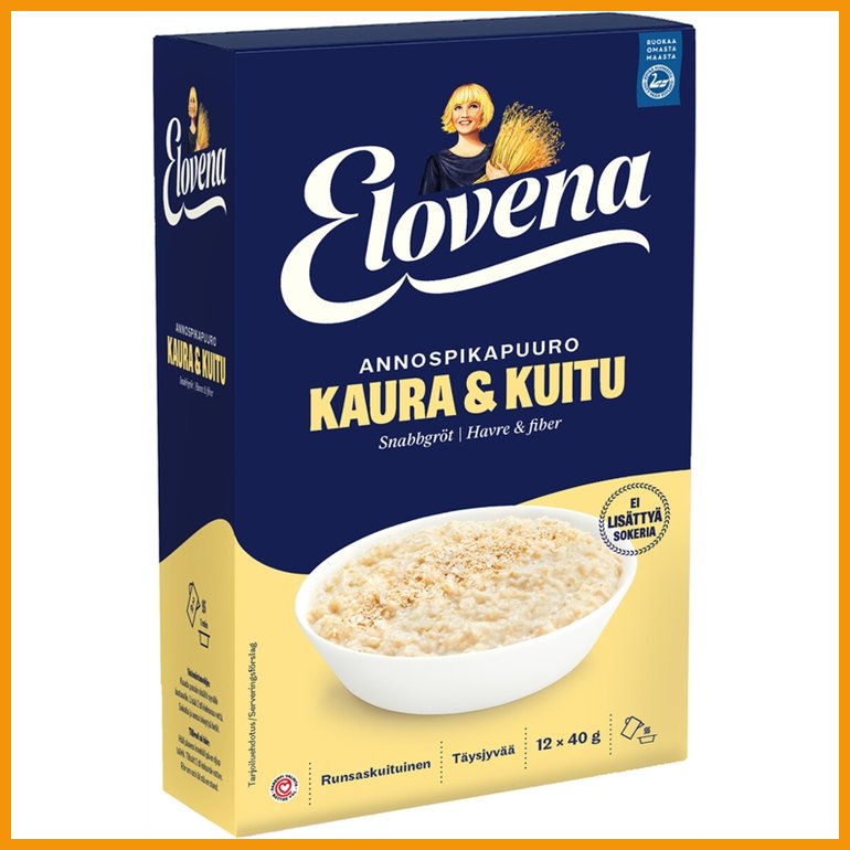 Elovena Kaura-Kuitu -annospikapuuro valmistuu minuutissa ja antaa energiaa päivän ponnistuksiin. Puuron valmistamiseen tarvitset vain lautasen ja kiehuvaa vettä. Runsaskuituinen tuote on valmistettu Suomessa suomalaisesta kaurasta.Pakkauksessa on 12 annospussia.