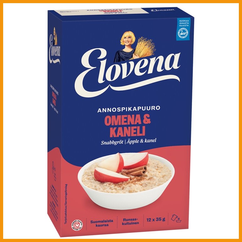 Elovena Omena-Kaneli -annospikapuuro valmistuu minuutissa ja antaa energiaa päivän ponnistuksiin. Puuron valmistamiseen tarvitset vain lautasen ja kiehuvaa vettä. Runsaskuituinen tuote on valmistettu Suomessa suomalaisesta kaurasta.Pakkauksessa on 12 annospussia.