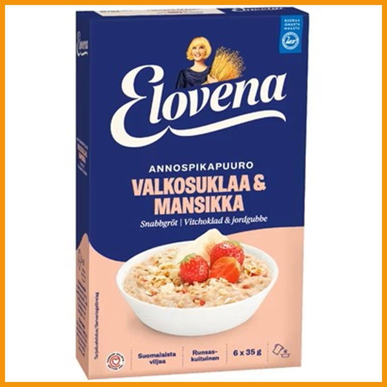 Elovena Valkosuklaa & Mansikka -annospikapuuro valmistuu minuutissa ja antaa energiaa päivän ponnistuksiin. Puuron valmistamiseen tarvitset vain lautasen ja kiehuvaa vettä. Runsaskuituinen tuote on valmistettu Suomessa suomalaisesta kaurasta.Pakkauksessa on 6 annospussia.
