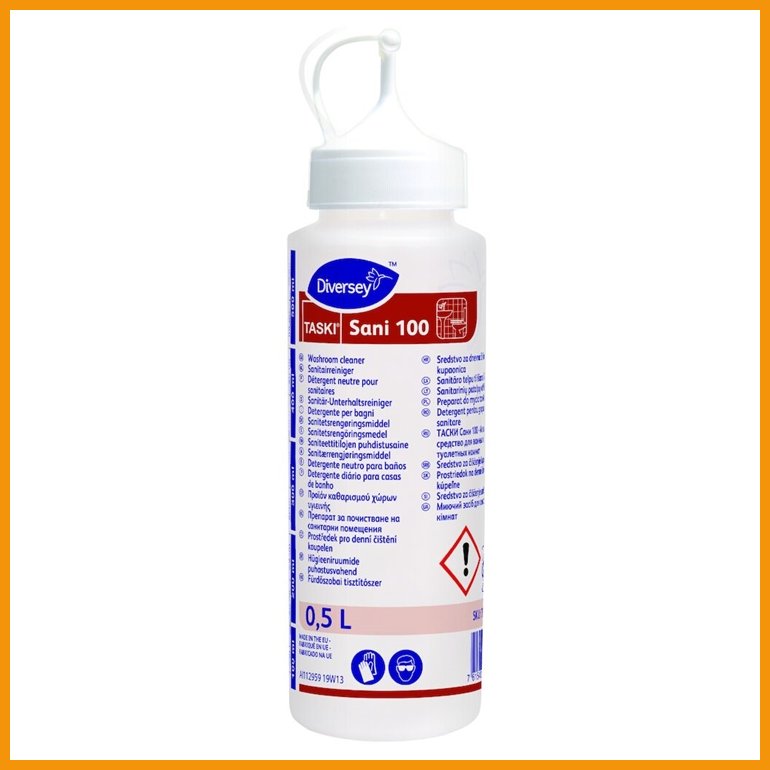 Annostelupullo Taski Sani 100 500 ml. Käyttöliuoksen tekoon ja annosteluun. Painettu tuotenimi. Käyttöalue kuvakkein.Annostelupullo Taski Sani 100 500 ml on upea siivousaine, jonka verkkokauppatilauksen toimitus perille kestää 1-2 päivää.