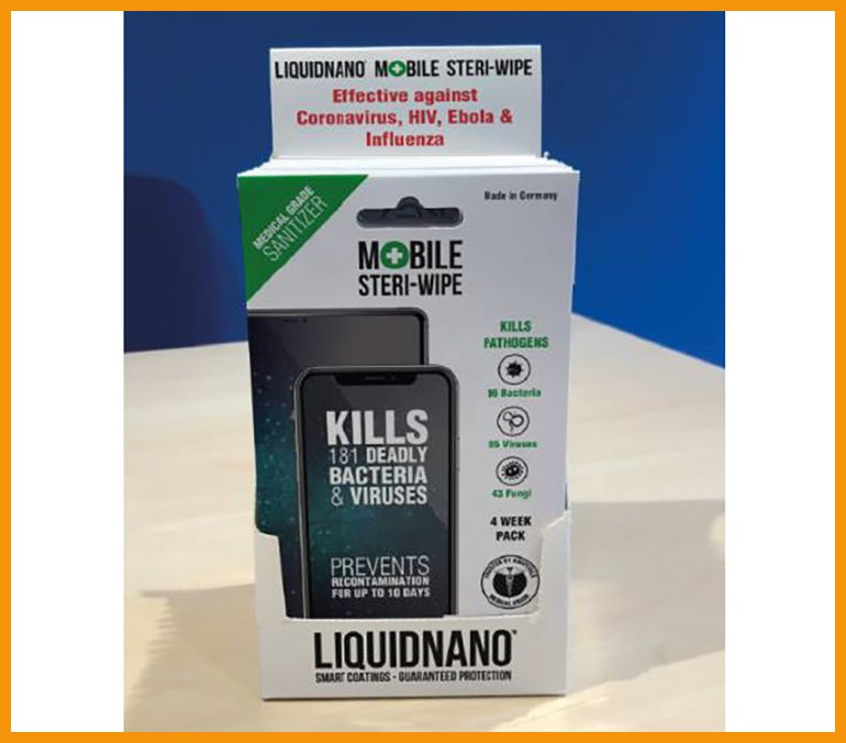 LiquidNano Mobile Steri-Wipe on antibakteerinen nanopinnoiteliina mobiililaitteiden suojaamiseen. Liinalla pyyhkiminen muodostaa näytölle erittäin ohuen ja pitkään kestävän kalvon, joka tappaa pinnalle kerrostuneet patogeenit ja tekee pinnan helpoksi puhdistaa. Pitkäkestoiseen desinfiointiin soveltuva liina toimii sekä viruksia, bakteereita että sienikasvustoja vastaan.