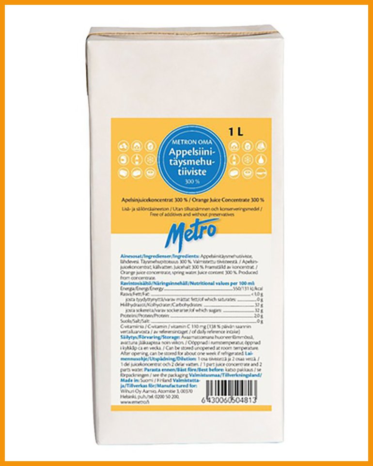 Metron appelsiinimehutiivisteessä ovat pitoisuudet kohdillaan. Suomessa valmistetun ja sekä lisä- että säilöntäaineettoman mehun täysmehupitoisuus on jopa 300 %. Litrasta tiivistettä saa kolme litraa valmista mehua.