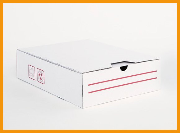 Aaltopahvista valmistettu ja sormikololla varustettu arkistokotelo soveltuu asiakirjojen säilytykseen. Laatikko on sisältä ruskea ja ulkoa valkoinen punaisilla yksityiskohdilla.FSC-sertifioitu tuote on valmistettu 70-prosenttisesti kierrätyskuidusta.
