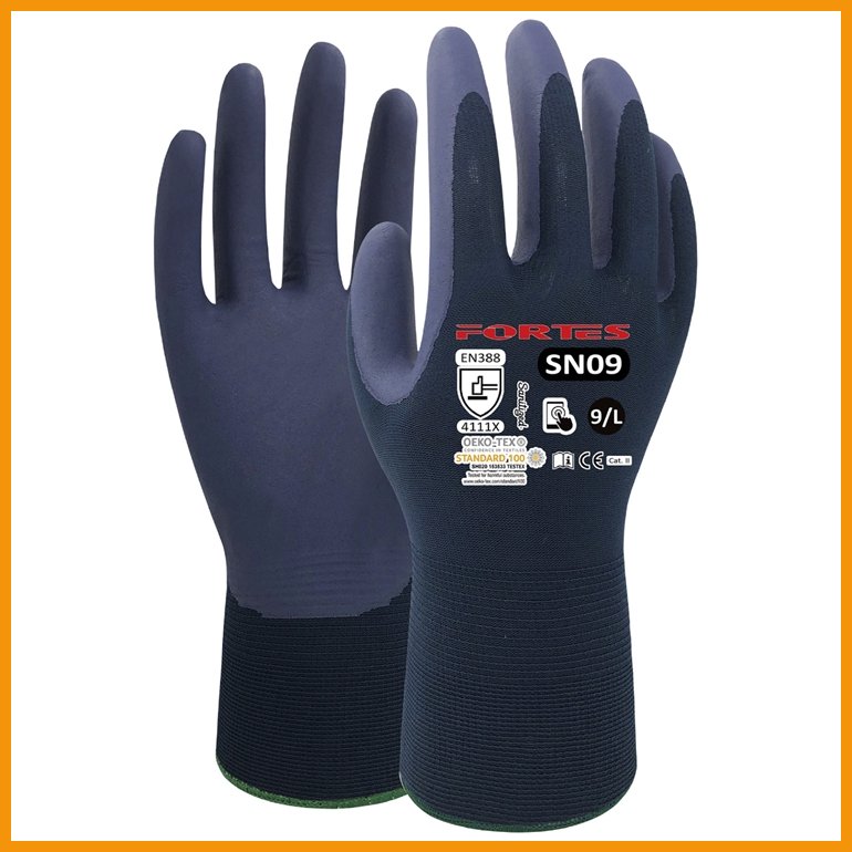 Fortes SN09 -asentajankäsine on kevyt, joustava ja istuu napakasti. Saumaton, vuoriton ja erinomaisesti hengittävä käsine pitää kätesi viileinä pitkänkin työrupeaman ajan. Nitriilipinnoitetun käsineen pinta sekä kestää erittäin hyvin kulutusta että toimii myös kosketusnäytöillä. Käsine on desinfiointikäsitelty erilaisten mikro-organismien ja bakteerien kasvun ja leviämisen ehkäisemiseksi.Koko: 10