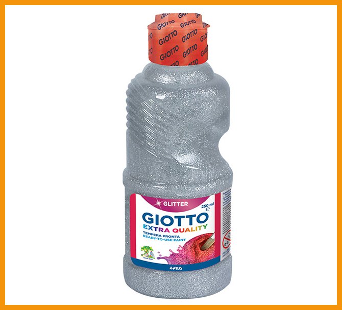 Giotto Glitter Paint on kimaltava, Redimix-tyyppinen askarteluväri. Läpinäkyvässä pohjageelissä on pieniä ja iloisesti kimaltavia glitterpaljetteja, jotka saavat taiteen säihkymään. Pullossa on näppärä annostelukorkki ja hyvän otteen antava kädensija. Vesipohjaiset ja lapsiturvalliset värit peseytyvät helposti käsistä saippualla ja lämpimällä vedellä, tai vaatteista 40 °C konepesussa.Pakkauskoko: 250 ml
