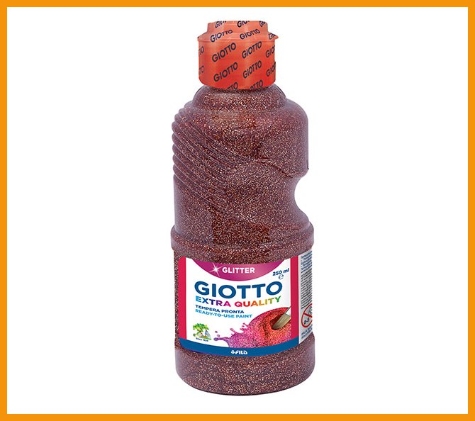 Giotto Glitter Paint on kimaltava, Redimix-tyyppinen askarteluväri. Glitterin värisessä pohjageelissä on pieniä ja iloisesti kimaltavia glitterpaljetteja, jotka saavat taiteen säihkymään. Pullossa on näppärä annostelukorkki ja hyvän otteen antava kädensija. Vesipohjaiset ja lapsiturvalliset värit peseytyvät helposti käsistä saippualla ja lämpimällä vedellä, tai vaatteista 40 °C konepesussa.Pakkauskoko: 250 ml