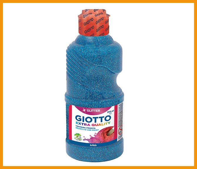 Giotto Glitter Paint on kimaltava, Redimix-tyyppinen askarteluväri. Glitterin värisessä pohjageelissä on pieniä ja iloisesti kimaltavia glitterpaljetteja, jotka saavat taiteen säihkymään. Pullossa on näppärä annostelukorkki ja hyvän otteen antava kädensija. Vesipohjaiset ja lapsiturvalliset värit peseytyvät helposti käsistä saippualla ja lämpimällä vedellä, tai vaatteista 40 °C konepesussa.Pakkauskoko: 250 ml