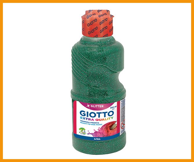 Giotto Glitter Paint on kimaltava, Redimix-tyyppinen askarteluväri. Glitterin värisessä pohjageelissä on pieniä ja iloisesti kimaltavia glitterpaljetteja, jotka saavat taiteen säihkymään. Pullossa on näppärä annostelukorkki ja hyvän otteen antava kädensija. Vesipohjaiset ja lapsiturvalliset värit peseytyvät helposti käsistä saippualla ja lämpimällä vedellä, tai vaatteista 40 °C konepesussa.Pakkauskoko: 250 ml