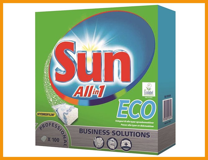Sun Pro Formula All-in-1 Eco on hajusteeton koneastianpesuainetabletti, joka sisältää pesuaineen lisäksi myös huuhtelukirkasteen ja suolan. Tehokkaasti valkuais- ja tärkkelyslikaa sekä tee- ja kahvitahroja myös alhaisemmissa lämpötiloissa (50 °C) poistava tuote soveltuu kaikenkovuisiin vesiin. Tabletit on yksittäispakattu vesiliukoiseen kelmuun.Tuotteella on EU Ecolabel -ympäristösertifikaatti.