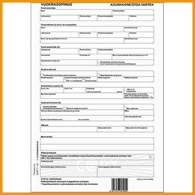 Plastipapin jäljentävästä paperista valmistettu Asuinhuoneiston vuokrasopimus P100 sisältää kaiken tarvittavan sopimustiedon sekä vuokraajalle että kiinteistönomistajalle.Kopioiden määrä: 1+1