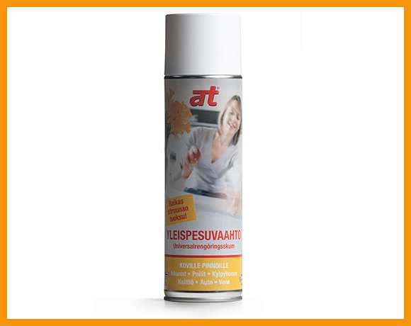 AT Yleispesuvaahto on valumaton ja tehokas yleispesuvaahto kovien pintojen puhdistukseen rasvasta, liasta, noesta ja muista epäpuhtauksista. Miellyttävästi sitruunalta tuoksuva tuote soveltuu mm. keittiöiden, kylpyhuoneiden, ajoneuvojen ja veneiden yleispuhdistusaineeksi. Aine toimii erinomaisesti myös lasipinnoilla, jotka se pesee säihkyvän kirkkaiksi eikä jätä kalvoa.