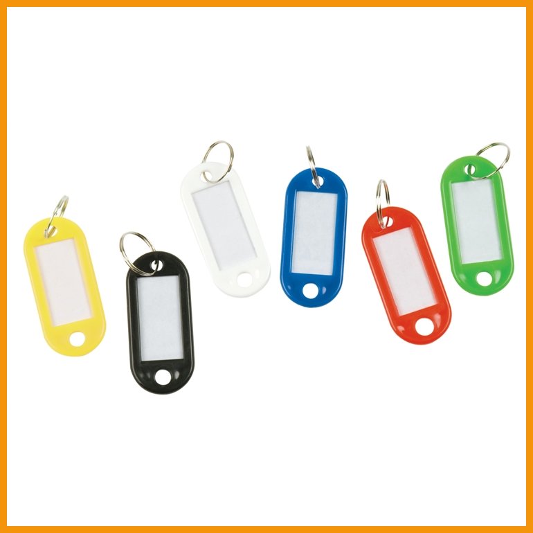 Q-CONNECTin avaimenperälajitelmassa on 100 eriväristä avaimenperää, joissa on valmiiksi tyhjät etiketit. Muoviset avaimenperät on rei'itetty molemmista päistä, ja toiseen päähän on kiinnitetty avainrengas.Mitat: 2,2 x 5 cm