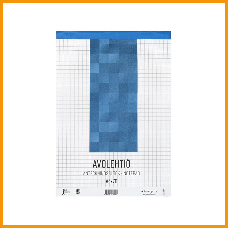 Paperipisteen piirtämiseen, luonnosteluun, ideointiin ja muistiinpanojen kirjoittamiseen soveltuvassa avolehtiössä on puuvapaasta paperista valmistetut, ruudutetut (7x7 mm) ja perforoidut sivut. Lehtiö on nidottu lyhyeltä sivultaan.Kotimaisella ja kestävästi valmistetulla Kotimaisella tuotteella on pohjoismainen Joutsenmerkki ja Avainlippu.