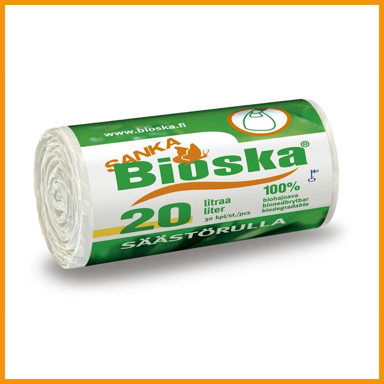 Kotimainen Bioska on biohajoavasta kalvosta valmistettu sangallinen roskapussi, joka käyttäytyy muuten aivan kuin perinteinen muovipussi, mutta käytön jälkeen sen voi sisältöineen heittää biojäteastiaan tai kompostiin, jossa se muuttuu muhevaksi mullaksi. Nopeasti kompostoituva Bioska soveltuu erinomaisesti sekä teolliseen biojätteen käsittelyprosessiin että kotikompostoriin.Tilavuus: 20 litraa