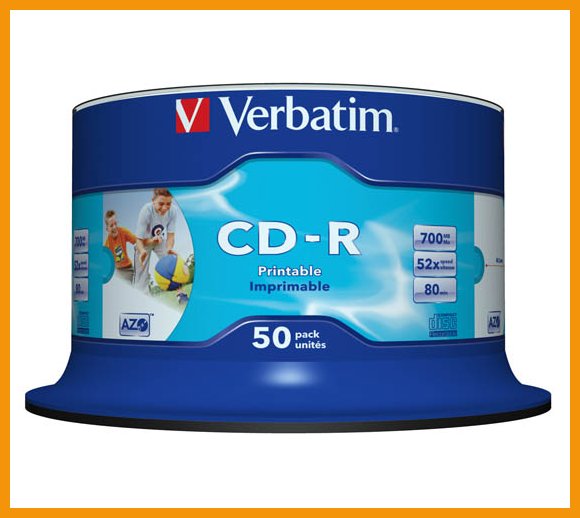 Verbatim Wide Inkjet Printable -CD-R-levyissä on erittäin korkean UV-suojauksen takaava AZO -kirjoituskerros ja pitkä elinikä. Levyjen valkoiseen pintaan voidaan tulostaa.Kapasiteetti: 700 MB