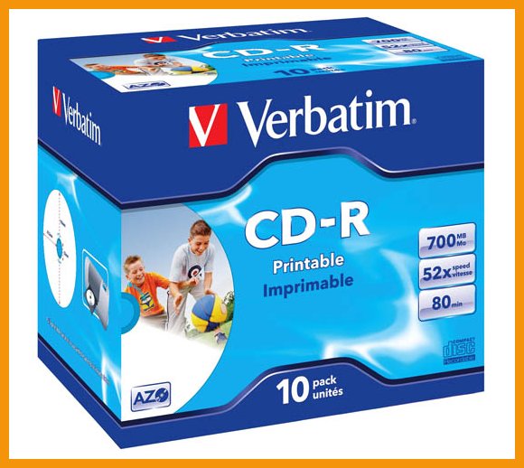 Verbatim Wide Inkjet Printable -CD-R-levyissä on erittäin korkean UV-suojauksen takaava AZO -kirjoituskerros ja pitkä elinikä. Levyjen valkoiseen pintaan voidaan tulostaa.Kapasiteetti: 700 MB
