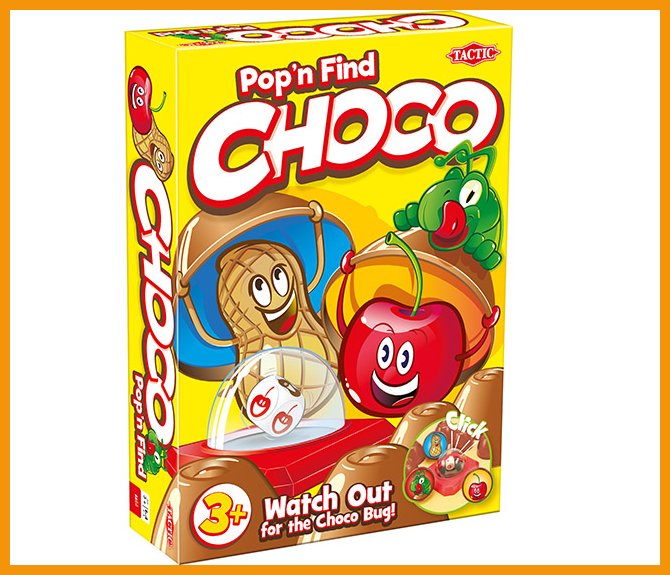 Choco on lasten suosikkipeli, jossa yhdistyy muisti- ja noppapeli. Paina pop-o-matic -nopan kupua ja yritä nostaa nopan tulosta vastaava suklaanappi pöydältä. Jos onnistut, saat pitää löytämäsi suklaanapin! Varo kuitenkin suklaata ahmivaa toukkaa! Eniten nappeja kerännyt pelaaja voittaa pelin! Yli 3-vuotiaille.Choco 3+ on laadukas askartelutarvike, jonka toimituksen kesto on verkkokaupasta tilattuna 1-2 päivää. Huomaa, että toimitus on ilmainen yli 140 € hintaisille verkkokauppa ostoksille! Meiltä voit tilata laskulla ja ilman rekisteröitymistä.