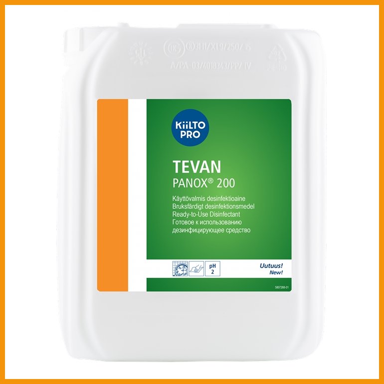Kiilto Pro Tevan Panox 200 on ammattikäyttöön kehitetty käyttövalmis desinfektioaine. Vetyperoksidiin ja peretikkahappoon tehonsa pohjaava aine soveltuu sekä useimpien kovien materiaalien ja tekstiilipintojen desinfiointiin että eritetahradesinfektioon hyvin monenlaisissa ympäristöissä, myös elintarviketeollisuudessa.Mikrobisidisesti laajakirjoinen ja tehokas desinfektioaine ei jätä pyyhintäjälkiä. Desinfektioteho on todennettu seuraavasti: EN 13697, EN 13727 bakteerit, EN 13697, EN 13624 hiivat, homeet, EN 14476 virukset (ml. norovirus, adenovirus), EN 13704 itiöt.