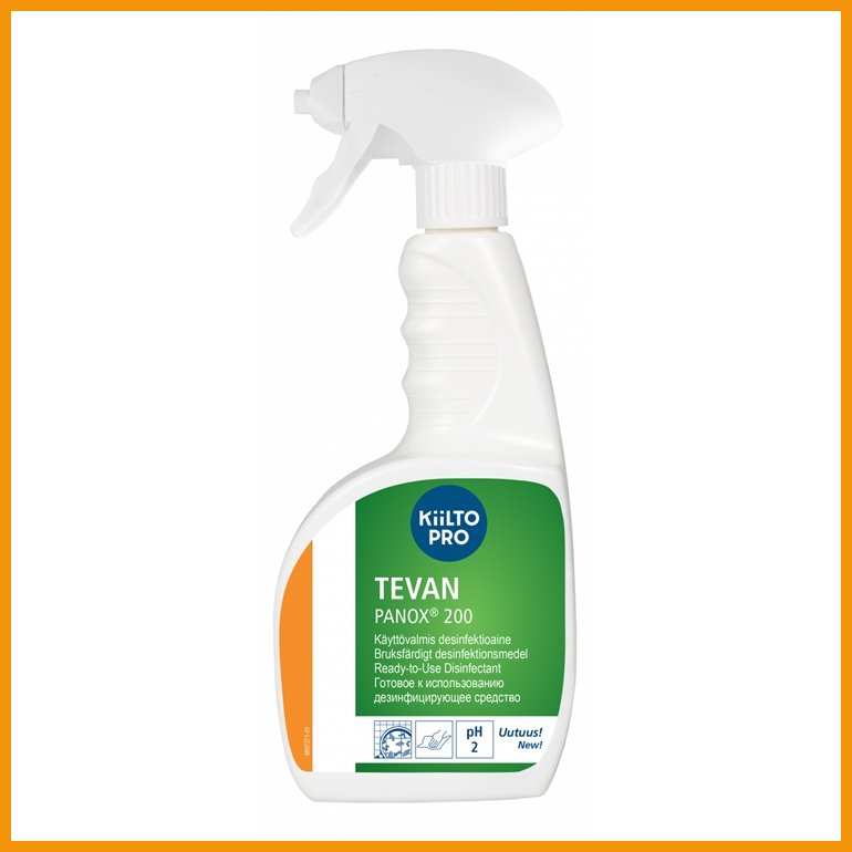 Kiilto Pro Tevan Panox 200 on ammattikäyttöön kehitetty käyttövalmis desinfektioaine. Vetyperoksidiin ja peretikkahappoon tehonsa pohjaava aine soveltuu sekä useimpien kovien materiaalien ja tekstiilipintojen desinfiointiin että eritetahradesinfektioon hyvin monenlaisissa ympäristöissä, myös elintarviketeollisuudessa.Mikrobisidisesti laajakirjoinen ja tehokas desinfektioaine ei jätä pyyhintäjälkiä. Desinfektioteho on todennettu seuraavasti: EN 13697, EN 13727 bakteerit, EN 13697, EN 13624 hiivat, homeet, EN 14476 virukset (ml. norovirus, adenovirus), EN 13704 itiöt.