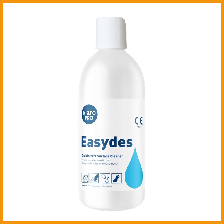 Kiilto Pro Easydes on mikrobisidisesti tehokas, käyttövalmis ja nopeavaikutteinen pesevä pintadesinfektioaine alkoholeja sietäville ei-invasiivisille lääkinnällisille laitteille. Etanolipohjainen, tutkitusti tehokas ja laajakirjoinen desinfektioaineseos sisältää peseviä aineosia ja kestää orgaanista rasitusta.Easydes poistaa hyvin lian ja rasvan sekä tuhoaa tehokkaasti bakteerit, virukset ja fungit. Aine saavuttaa desinfektiotehon myös näkyvästi kontaminoituneilla pinnoilla. Tuotteen mikrobisidinen teho on tutkittu: EN 13727 (bakteerit), EN 13697 (bakteerit, hiivat, homeet), EN 13624 (hiivat), EN 14348 (tuberkuloosi ja mykobakteerit), EN 14476 (adeno- ja norovirus), EN 14561 (bakteerit), EN 14562 (hiivat, homeet), EN 14563 (mykobakteerit ja tuberkuloosi), EN 16615 One System Basic-pyyhkeillä sekä Easydes desinfektiopyyhkeillä.