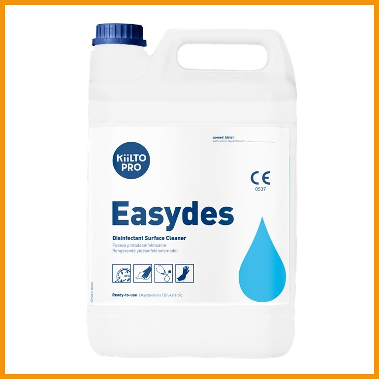 Kiilto Pro Easydes on mikrobisidisesti tehokas, käyttövalmis ja nopeavaikutteinen pesevä pintadesinfektioaine alkoholeja sietäville ei-invasiivisille lääkinnällisille laitteille. Etanolipohjainen, tutkitusti tehokas ja laajakirjoinen desinfektioaineseos sisältää peseviä aineosia ja kestää orgaanista rasitusta.Easydes poistaa hyvin lian ja rasvan sekä tuhoaa tehokkaasti bakteerit, virukset ja fungit. Aine saavuttaa desinfektiotehon myös näkyvästi kontaminoituneilla pinnoilla. Tuotteen mikrobisidinen teho on tutkittu: EN 13727 (bakteerit), EN 13697 (bakteerit, hiivat, homeet), EN 13624 (hiivat), EN 14348 (tuberkuloosi ja mykobakteerit), EN 14476 (adeno- ja norovirus), EN 14561 (bakteerit), EN 14562 (hiivat, homeet), EN 14563 (mykobakteerit ja tuberkuloosi), EN 16615 One System Basic-pyyhkeillä sekä Easydes desinfektiopyyhkeillä.