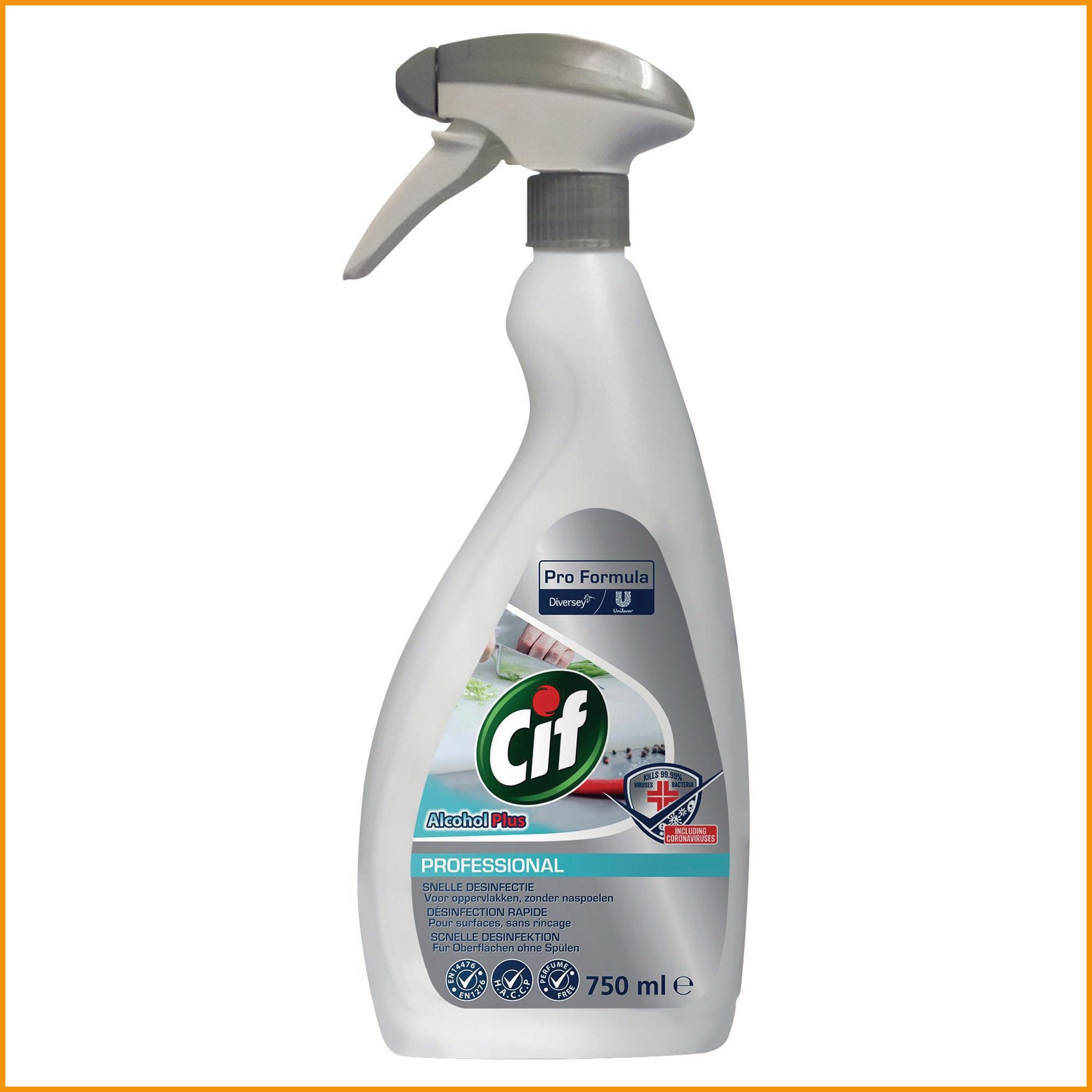 Cif Alcohol Plus Professional on alkoholipohjainen pintojen desinfiointiaine. Se sopii alkoholia kestäville pinnoille ja soveltuu erinomaisesti keittiötiloihin ja pinnoille, joilla käsitellään elintarvikkeita. Tuote on käyttövalmis ja tehokas bakteereiden, hiivojen ja virusten tuhoamiseen. Tuhoaa 99,99 % viruksista 1 minuutin vaikutusajalla, mikä on laajoin EN-testein todennettu. Tehoaa myös koronavirukseen. Tuotteen tehoaineena on 77 % etanoli ja se haihtuu pinnoilta jäämiä jättämättä, jälkihuuhtelua ei siis tarvita. Tuote ei sisällä hajusteaineita. EN14476: virukset (Polivirus, Adenovirus, MNV): 99,99%. 1 min, puhtaat olosuhteet EN16777: virukset (adenovirus, MNV): 99,99%. 2 min, puhtaat olosuhteet EN1276: bakteerit 99.999%. 15 sek, puhtaat olosuhteet EN13697: bakteerit 99.99%, hiivat 99.9%, 5 min puhtaat olosuhteet EN13727: bakteerit 99.999%, 15 sek. puhtaat olosuhteet Desinfiointiaineen minimitilaus 1. Tukkupakkauksessa 6.Desinfiointiaine Cif alcohol plus 750ml on tasokas desinfiointiaine, jonka verkkokaupan tilauksen toimitus kestää 1-2 päivää. Muistathan, että ilmainen toimitus on kaikilla yli 140 € hintaisilla tilauksilla! Meiltä voit tilata laskulla ja ilman rekisteröitymistä.