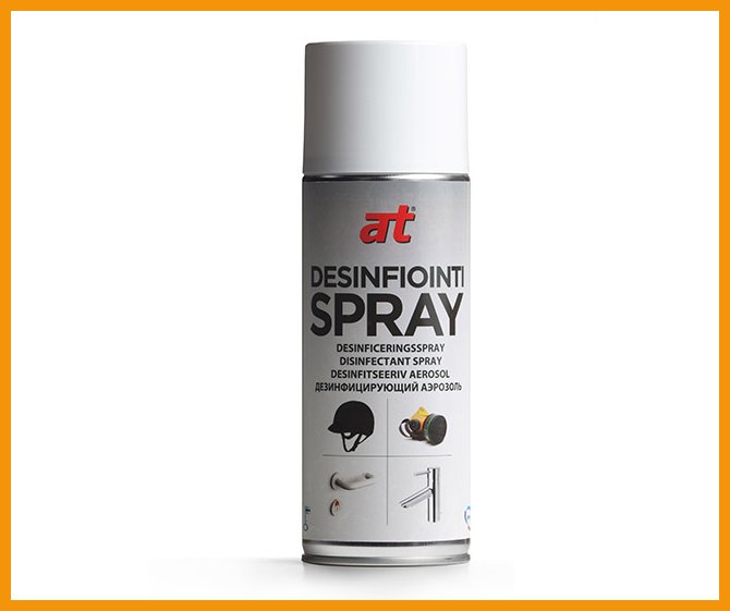 AT Desinfiointispray 7110 on aerosolipohjainen desinfiointispray, joka sisältää etanolia, biosidejä ja ponneaineita. Suihkutettaessa ponneaineet haihtuvat ja pinnalle levittyy etanolin ja biosidin seos, joka desinfioi nopeasti ja tunkeutuu myös hankalasti saavutettaviin paikkoihin.Sopivia käyttökohteita ovat kaikki kodin ja julkisten tilojen pinnat sekä saniteettitilat, sairaalat, kaupat, taksit, parturit, hoitolaitokset, kuntosalit, korjaamot, ravintolat, kiinteistöhuollot, sekä työ- ja harrastusvälineet. Aine ei vahingoita kovia pintoja ja haihtuu nopeasti.