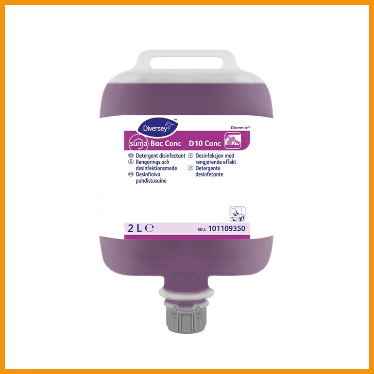 Desinfioiva puhdistusaine Suma Bac conc D10 2l on tehokas aine ruuanvalmistustilojen kaikkien pintojen yhdistettyyn pesuun ja desinfiointiin. Suma Bac D10 conc on nestemäinen, ruuanvalmistustilojen kaikille pinnoille soveltuva desinfioiva puhdistusaine. Tuotteen desinfiointiteho perustuu kvaternaarisiin ammoniumyhdisteisiin eli kvatteihin. Sisältämiensä pinta-aktiivisten aineiden ja kompleksointiaineiden ansiosta Suma Bac conc D10 puhdistaa ja desinfioi tehokkaasti kaikissa veden kovuuksissa. Suma Bac conc D10 on edullinen käytössä, koska sen annostelu tapahtuu tarkan annostuksen tuottavan Divermite-käyttöliuosjärjestelmän avulla.