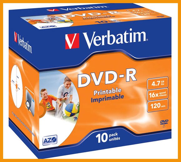 Verbatim Wide Inkjet Printable -DVD-R-levyissä on erittäin korkean UV-suojauksen takaava AZO -kirjoituskerros ja pitkä elinikä. Levyjen valkoiseen pintaan voidaan tulostaa.Kapasiteetti: 4,7 GB
