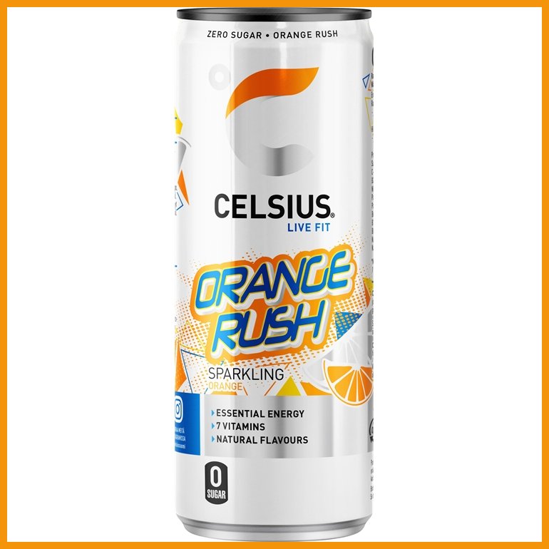 Celsius Energyn pirskahteleva Orange Rush -energiajuoma virkistää sekä maullaan että ravintosisällöllään. Appelsiinin maku vie mielen tropiikkiin, etenkin kylmän raikkaana nautittuna! Vegaaniseen ruokavalioon sopiva juoma on sokeriton ja runsaasti vitaminoitu. Sisältää 200 mg kofeiinia. Hinta ei sisällä panttia.Sisältö: 335 ml.