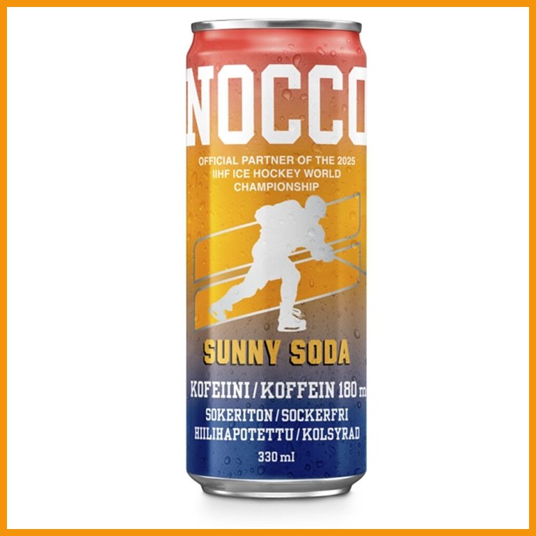 Nocco BCAA Sunny Soda on makean persikan ja raikkaan vadelman makuinen energiajuoma. Kevyesti hiilihapotetussa, vihreästä teestä uutetussa juomassa on runsaasti vitamiineja, 3000 mg BCAA-aminohappoja ja 180 mg kofeiinia, muttei lainkaan sokeria. Makeutusaineena on sukraloosi.Laatikossa on 24 tölkkiä á 0,33 litraa. Hinta ei sisällä panttia.