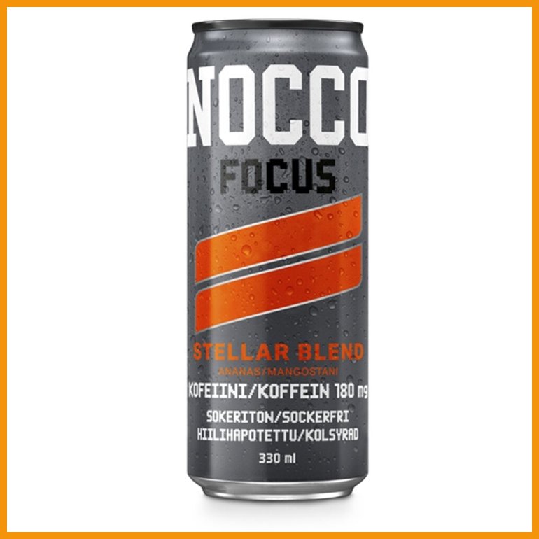 NOCCO Focus Stellar Blend on vinkeä yhdistelmä kirpeää ananasta ja makeaa mangostania. Hiilihapotetussa, vihreästä teestä uutetussa energiajuomassa on runsaasti vitamiineja ja 180 mg kofeiinia, muttei lainkaan sokeria. Makeutusaineena on sukraloosi.Sisältö: 0,33 litraa