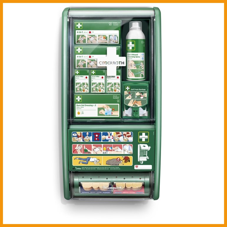 Cederrothin Ensiapuasema sisältää tuotteita sekä pienten haavojen että palovammojen hoitoon, jotka edustavat suurinta osaa työpaikoilla sattuneista vammoista. Ensiapuaseman tarvikkeet ovat läpinäkyvän kannen ansiosta selkeästi havaittavissa, jolloin täydennystarpeet näkee yhdellä silmäyksellä.Asema on varustettu Salvequick-laastariautomaatilla. Laastarit vedetään alaspäin, jotta vältetään muiden laastareiden likaantuminen tai kastuminen. Aseman lokerikossa on tilaa täydentää sisältöä oman työpisteen erityistarpeiden mukaan.