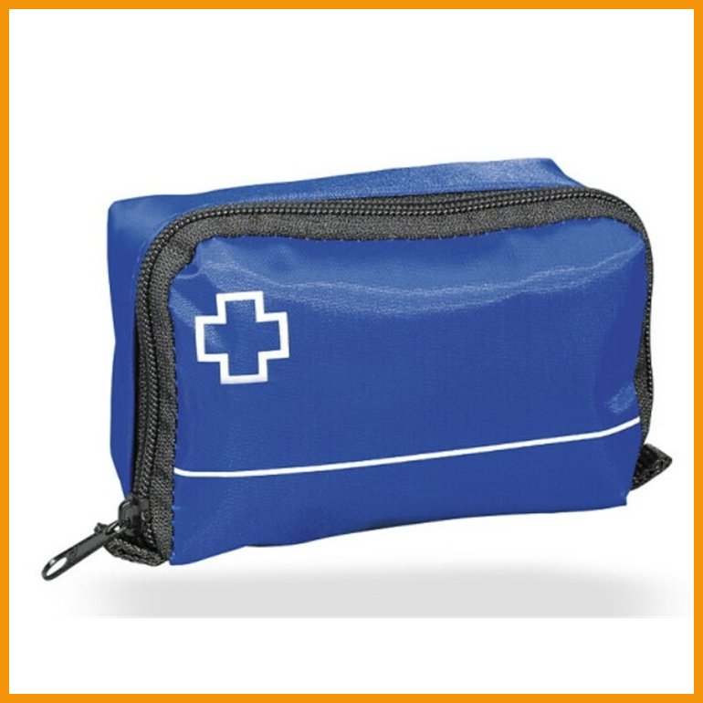 Sininen ensiapulaukku.Sisältö: