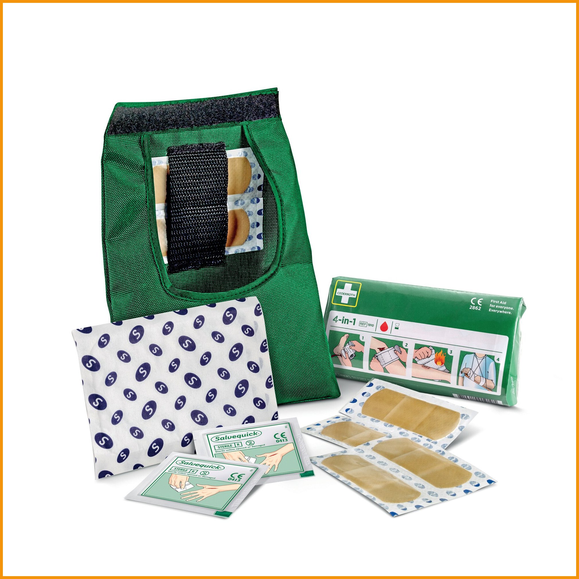 Pieni ensiapupakkaus, hyvin varusteltu. Pakkaus on valmistettu kestävästä nailonista, joka suojaa tuotteet lialta ja pölyltä. Tarrakiinnitys tekee pakkauksesta helposti avattavan. Selkeät kuvalliset ohjeet.