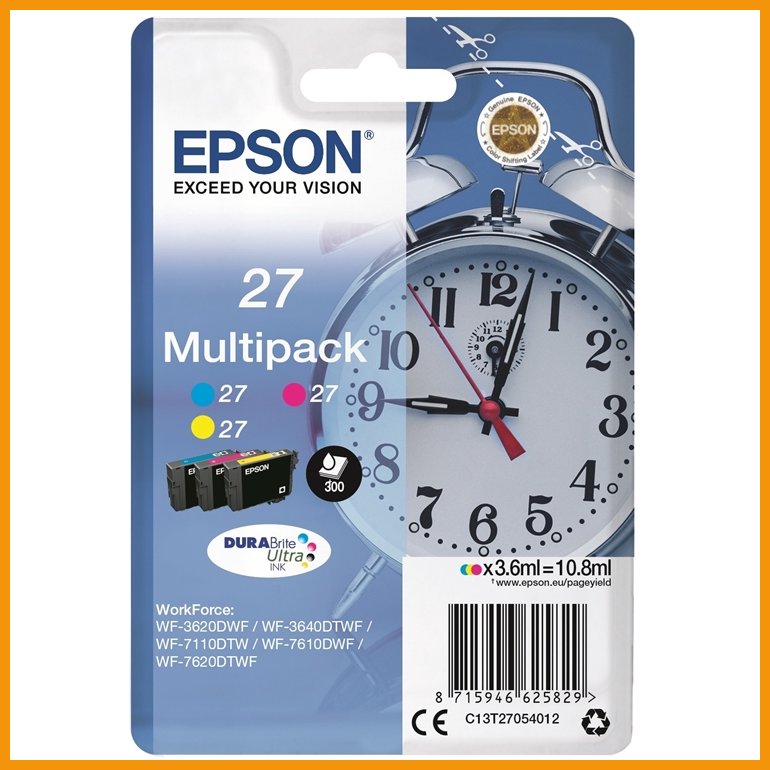 Kolmen värin Epson 27 Multipack -mustekasettisetti Epson-tulostimeesi. Valmistajan alkuperäisiä osia käyttämällä varmistat laitteen saumattoman toiminnan ja tuotat laadukkaita tulosteita. Epson panostaa jatkuvasti mustekasettien tuotekehitykseen. Epson - luotettava, edullinen ja korkealaatuinen. Pakkauksessa on kolme mustekasettia.Tuotenimi: Epson 27 Multipack