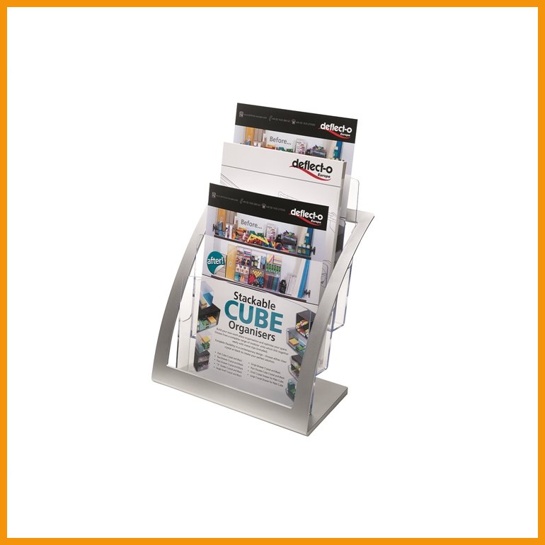 Tyylikkäästi muotoiltu Contemporary-esiteteline sopii erinomaisesti esimerkiksi odotustiloihin, vastaanottoon ja messuille. Pöytämallisessa telineessä on kolme lokeroa lehdille/esitteille ja erillinen lokero käyntikorteille. Yhteen lokeroon mahtuu aikakauslehtikokoinen (22,5 cm levyinen) esite. Lokeron leveys on 2,5 cm.Mitat: 285 x 340 x 160 mm