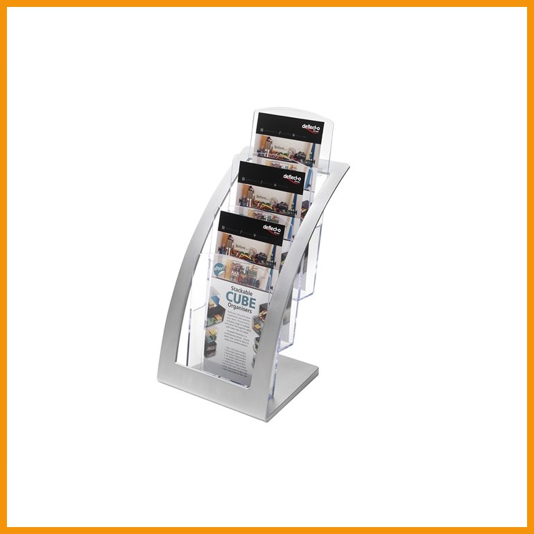 Tyylikkäästi muotoiltu Contemporary-esiteteline sopii erinomaisesti esimerkiksi odotustiloihin, vastaanottoon ja messuille. Pöytämallisessa telineessä on kolme lokeroa lehdille/esitteille ja erillinen lokero käyntikorteille. Yhteen lokeroon mahtuu esitekokoinen (11,5 cm levyinen) dokumentti. Lokeron leveys on 2,5 cm.Mitat: 174 x 350 x 155 mm