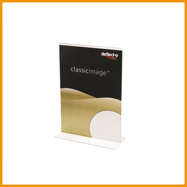 Pöytämallinen Deflecto-esiteteline sopii esitteille, tiedotteille, ohjeistuksille yms. Teline on valmistettu kirkkaasta polystyreenistä, ja esite näkyy esteettömästi kahteen suuntaan.Koko: A4, T-malli.