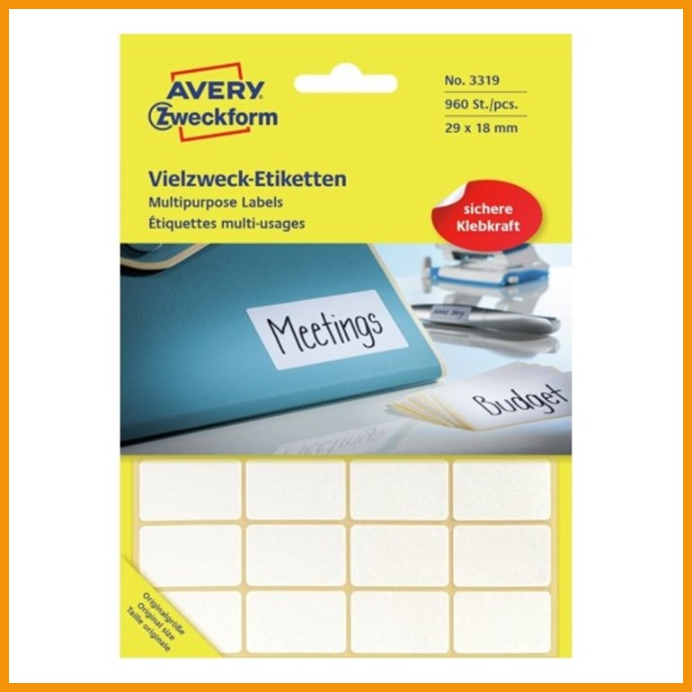 Etiketti Avery 3319 29 x 18 mm /960 on laadukas toimistotuote, jonka toimituksen kesto on verkkokaupasta tilattuna 1-2 päivää. Huomaa, että toimitus on ilmainen yli 140 € hintaisille verkkokauppa ostoksille! Meiltä voit tilata laskulla ja ilman rekisteröitymistä.