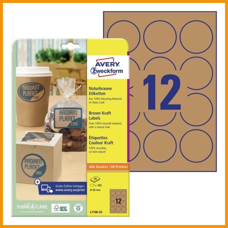 Averyn ruskeat ja malliltaan pyöreät etiketit on valmistettu 100-prosenttisesti kierrätysmateriaalista. Etiketit soveltuvat niin kopiointiin kuin sekä laser- että mustesuihkutulostukseenkin ilman tukoksia tai mustetahroja.